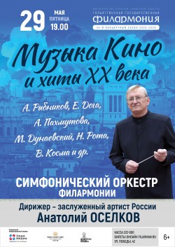 В нашей майской программе «Музыка кино и хиты XX века» встретятся два, казалось бы, разных мира: популярная музыка эстрады, кино и высокая профессиональная культура. За пультом — заслуженный артист России Анатолий Оселков, дирижёр, для которого киномузыка стала профессиональным увлечением.
